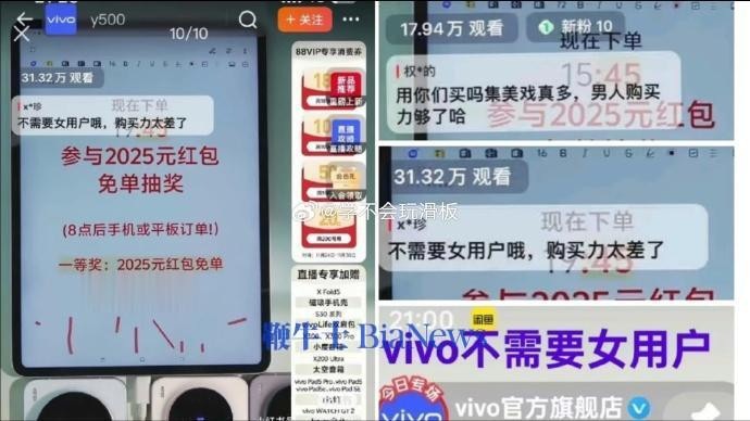 此前,vivo官方直播间被曝多次人工置顶“用你们买吗集美戏真多,男人购买力够了哈”“不需要女用户哦,购买力太差”等充满性别歧视的言论,瞬间点燃舆论怒火。
